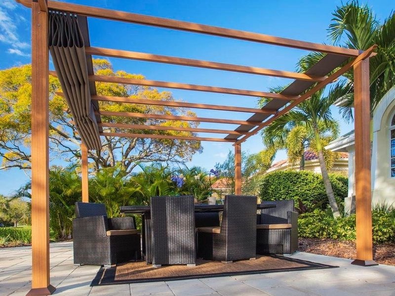 Die Pergola ist nicht mit einem festen Hardtop ausgestattet, sondern mit einer luftigen Lamellenkonstruktion. Für flexible Beschattung sorgt ein Polyester-Sonnensegel mit einer Stärke von 0,8 mm, das bis zu 70 % UV-Schutz bietet. Das Tuch ist wasserabweisend und lässt sich leicht mit einem weichen Tuch und Seifenwasser reinigen.