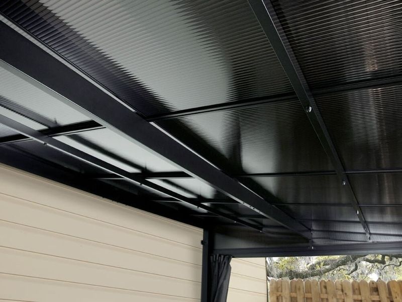 Das Dach der Pergola besteht aus 8 mm doppelwandigen Platten und zwei Verstärkungsprofilen. Das Dach ist UV-beständig. Diese Paneele halten einer Belastung von bis zu 125 kg/m² stand. Dadurch kann die Pergola das ganze Jahr über an ihrem Platz bleiben. Die Dachpaneele sind wasserdicht und bieten hervorragenden Schutz gegen Witterungseinflüsse.