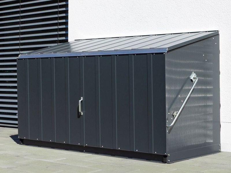 Das große Klappdach mit Spannfedern ermöglicht einen einfachen und sicheren Zugang zum gelagerten Inhalt. Türen und Dach werden vormontiert geliefert, was den Aufbau erleichtert und beschleunigt.