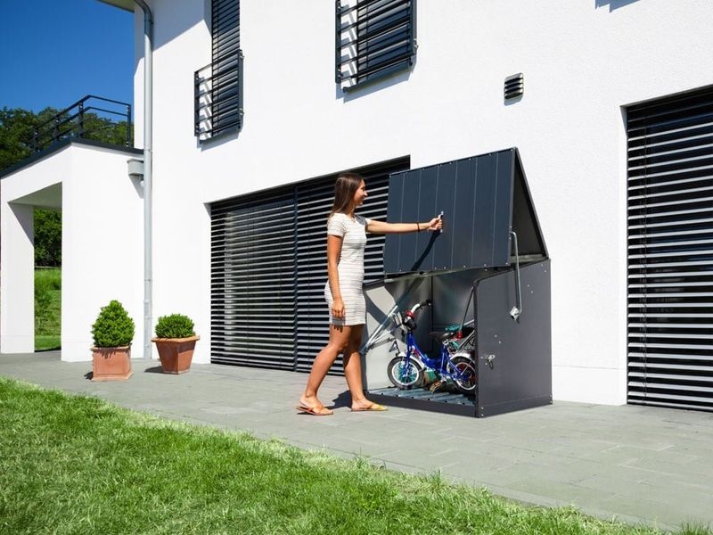 Metall-Aufbewahrungsbox Stowaway ist eine praktische Lösung zur sicheren Aufbewahrung von Gartengeräten, Werkzeugen und Fahrrädern. Dank ihrer kompakten Abmessungen eignet sie sich ideal für den Einsatz im Garten, rund ums Haus oder in kleineren Räumen.