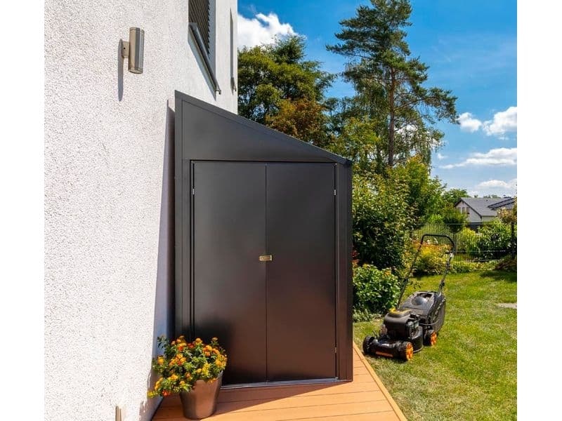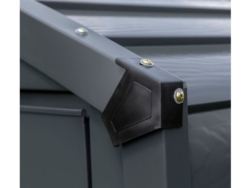 Der Gartenschuppen vereint alle Vorteile einer extrem robusten Konstruktion aus Stahlblech mit einer zeitlosen und modernen Farbe, die sich dezent in jede Umgebung einfügt. Im Gegensatz zu Holzunterständen erfordert dieser Blechunterstand keine regelmäßige Pflege oder Wartung.