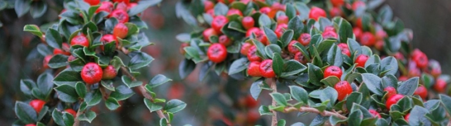 Feuerdorne (Pyracantha): Immergrüne Ziersträucher mit einer Wuchshöhe von bis zu 3 Metern. Ihre Beliebtheit ist der Tatsache zu verdanken, dass sie recht anspruchslos sind, zudem sind sie geeignet für eine winterharte Hangbepflanzung. Es empfiehlt sich Feuerdorne nah an Wänden zu pflanzen, wo ihre Früchte – die bunt gefärbten Beeren – am besten zum Vorschein kommen.
