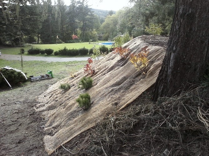 2. Auspflanzung: Größere Pflanzen, Sträucher und Bäume können auch vor der Verlegung der Kokosmatte gesetzt werden. Die kleineren Pflanzen lassen sich auch durch die verlegte Matte anpflanzen, diese gehört nur mit einem scharfen Werkzeug leicht an- bzw. durchzuschneiden; die Setzlinge werden dann durch die Einschnitte eingefädelt.