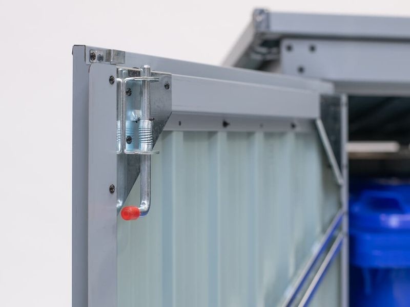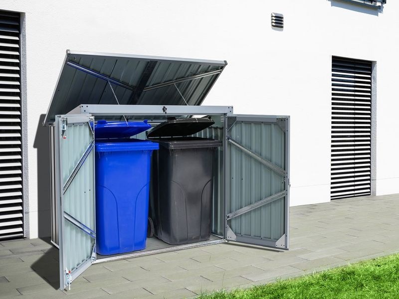 Dank der Gasdruckfedern lässt sich der Deckel leicht und sicher öffnen. Extra breite Türen (135 × 124 cm) ermöglichen eine komfortable Handhabung der Mülltonnen. Integrierte Belüftungsöffnungen verhindern die Ansammlung von Feuchtigkeit und unangenehmen Gerüchen, während das schräge Dach Regen- und Schmelzwasser zuverlässig nach hinten ableitet.
