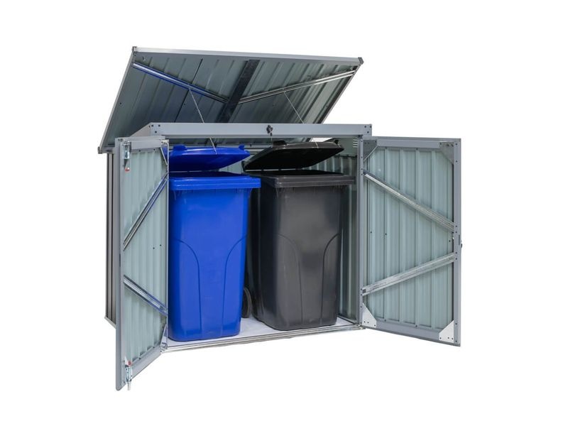Stahl-Mülltonnenbox von Westmann ist eine praktische und sichere Lösung für zwei Abfallbehälter mit einem Volumen von je 240 Litern. Die robuste Konstruktion aus verzinktem Stahlblech ist äußerst widerstandsfähig gegen Korrosion, Witterungseinflüsse und mechanische Beschädigungen. Profilverstärkungen sorgen für zusätzliche Stabilität und Langlebigkeit.