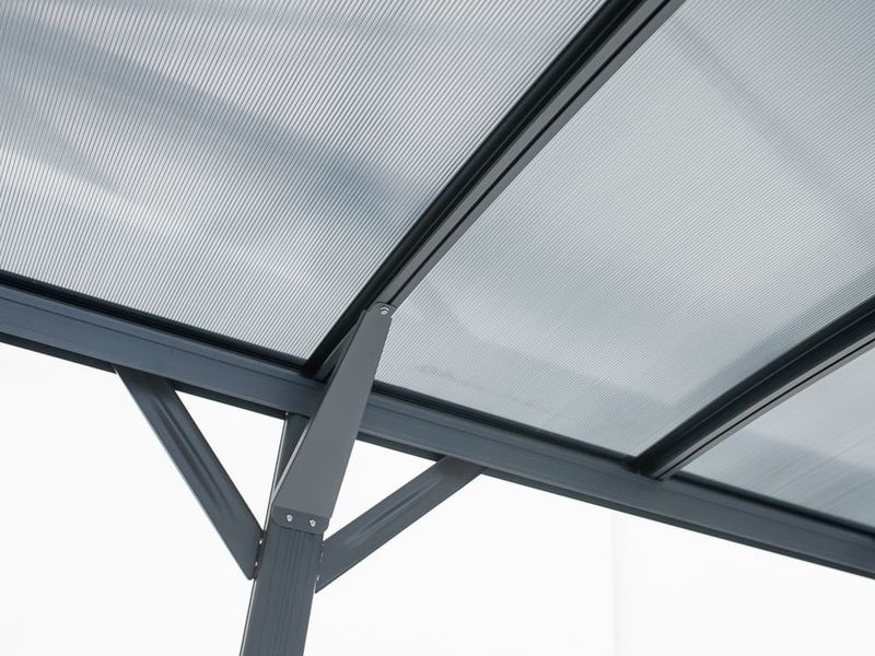 Das Dach besteht aus 6 mm starken Doppelsteg-Polycarbonatplatten, die UV-beständig sind und ausreichend Licht durchlassen. Im Lieferumfang ist außerdem ein integriertes Regenrinnensystem enthalten, das für einen effizienten Wasserablauf sorgt.