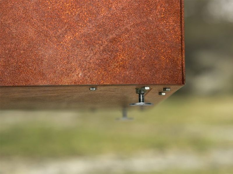 Die Konstruktion besteht aus 4 Seitenwänden aus original schwedischem COR-TEN®-Stahl mit doppelt umgebogener Oberkante, die für Stabilität sorgt und gleichzeitig einen sauberen Abschluss bildet.