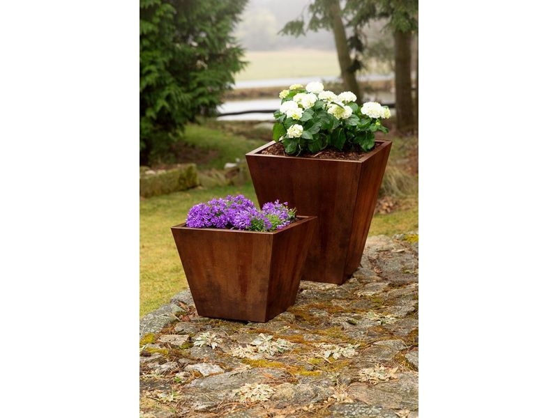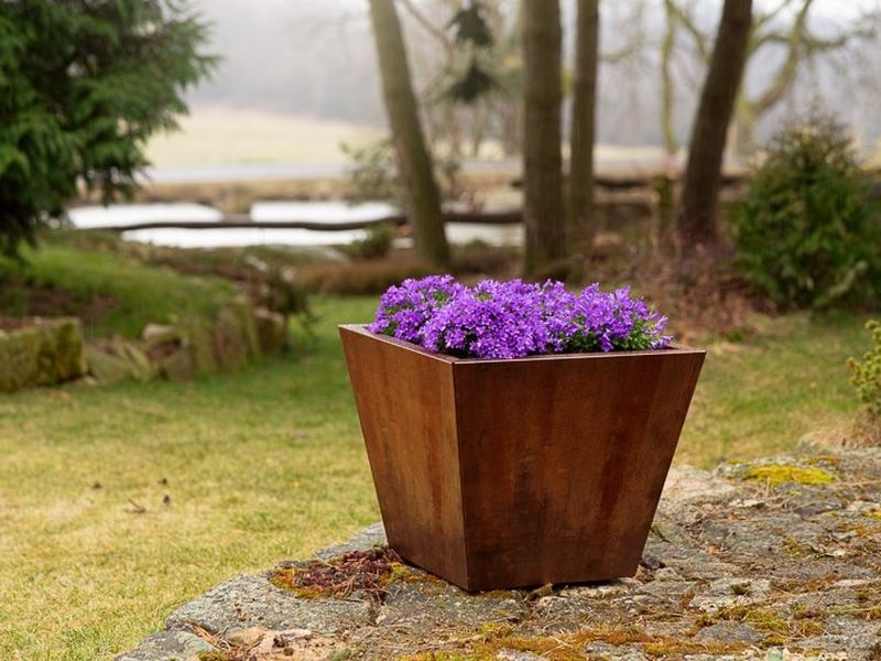 Garten-Pflanzkübel aus Cortenstahl für den ganzjährigen Außeneinsatz. Hergestellt in Tschechien. Blechstärke 1 mm. Boden mit Drainageöffnungen und verstellbare Füße im Lieferumfang enthalten.