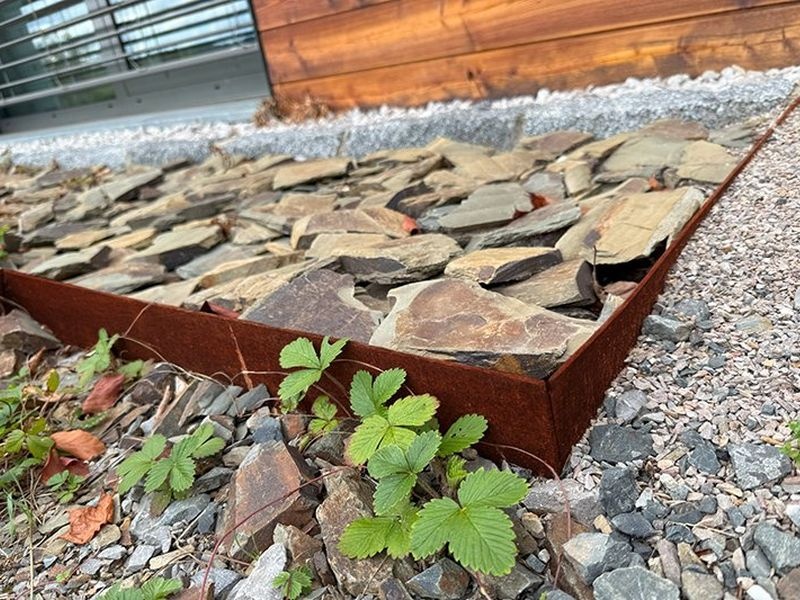 Cortenstahl mit rostiger Patina harmoniert optisch mit Naturstein, Ziegel oder dekorativen Pflanzflächen.