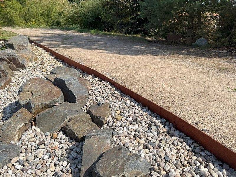 Cortenstahl-rasenkanten entlang des mit Kies bedeckten Weges