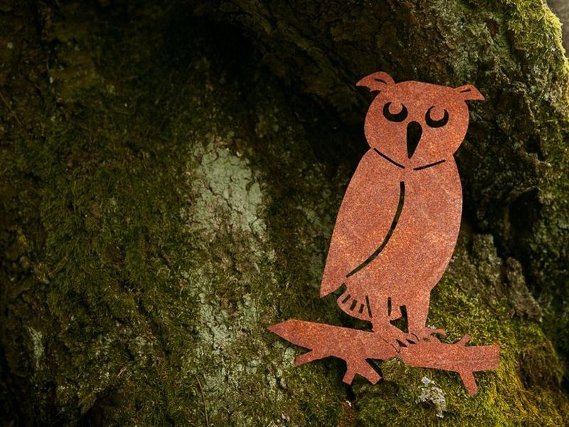 Die Eule – Symbol für Weisheit, Stille und Nacht – wirkt wie eine Szene aus einer Abendgeschichte. Die Metall-Silhouette einer auf einem Ast sitzenden Eule belebt Gärten, Spielbereiche, Naturpfade oder öffentliche Räume.
