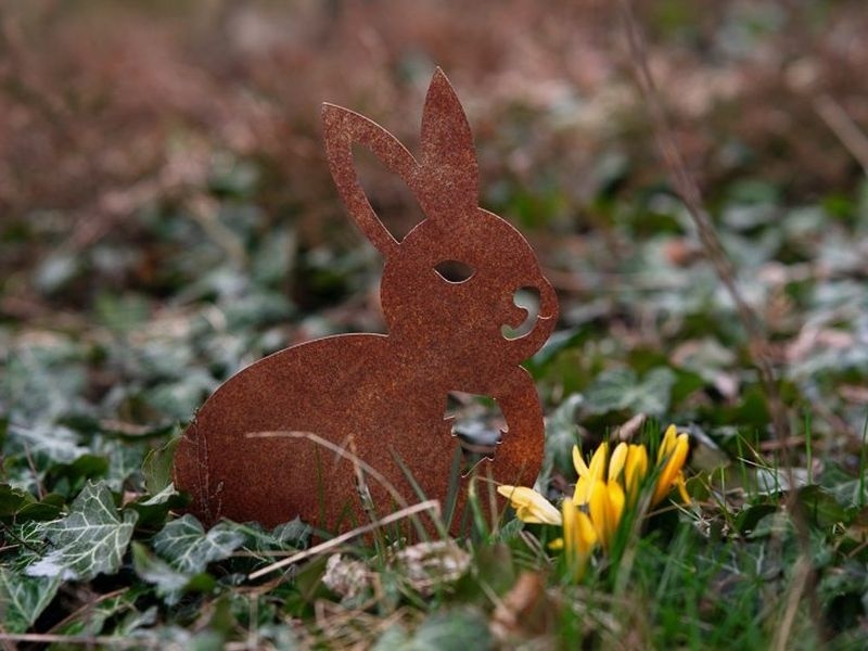 Dank der integrierten Montageplatte kann die Gartendeko aus Cortenstahl in Erde, Beete, Rasen oder Pflanzgefäße gesteckt werden.