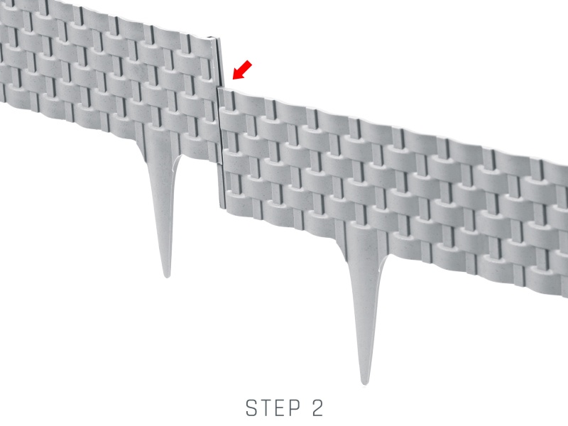 2. Zum Anschließen des nächsten Teils dienen integrierte Einrastelemente an Palisadenenden. Einfach zusammenklicken und beliebig lange Rasenkanten bilden.