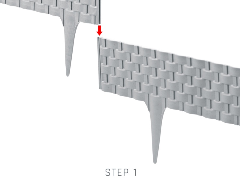 2. Zum Anschließen des nächsten Teils dienen integrierte Einrastelemente an Palisadenenden. Einfach zusammenklicken und beliebig lange Rasenkanten bilden.