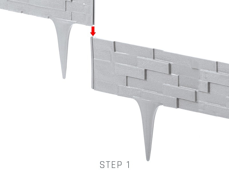 Die Palisaden-Rasenkante wird einfach mit dem Kunststoffdorn in den Boden gestochen/ eingeschlagen und dadurch verankert. Die einzelnen Elemente werden mit integriertem Klicksystem zusammengesteckt und so lassen sich beliebig lange Einfassungen gestalten.
