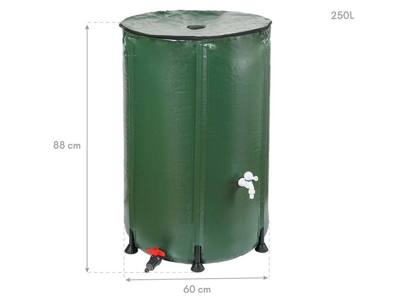 Die Konstruktion besteht aus einem robusten PVC-Rahmen und einer UV-beständigen Abdeckung, die zuverlässig gegen Witterungseinflüsse schützt. Der Behälter ist mit einem Reißverschlussdeckel und einem Schutznetz gegen Verschmutzung ausgestattet sowie mit zwei Ablassventilen – eines zum Anschluss eines Gartenschlauchs und das andere zum einfachen Befüllen einer Gießkanne. Dank des durchdachten Systems ist die Montage schnell und erfordert kein spezielles Werkzeug.
