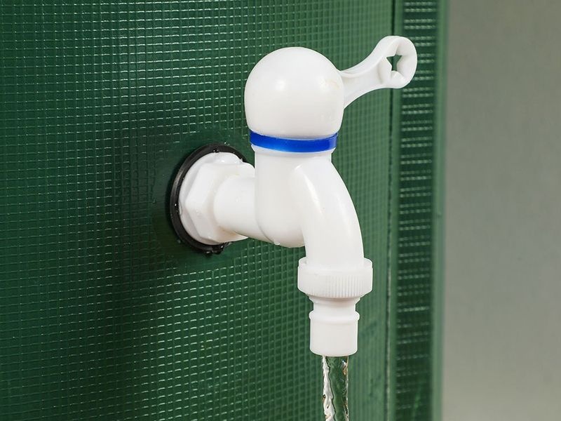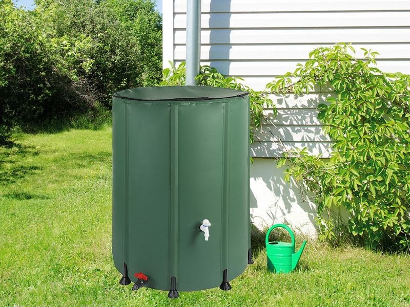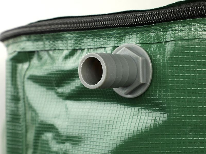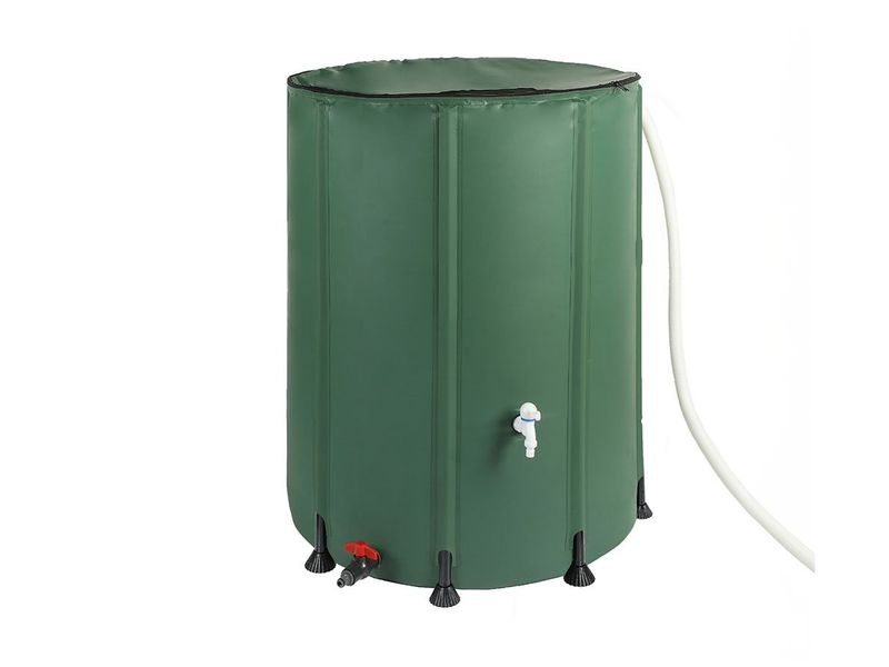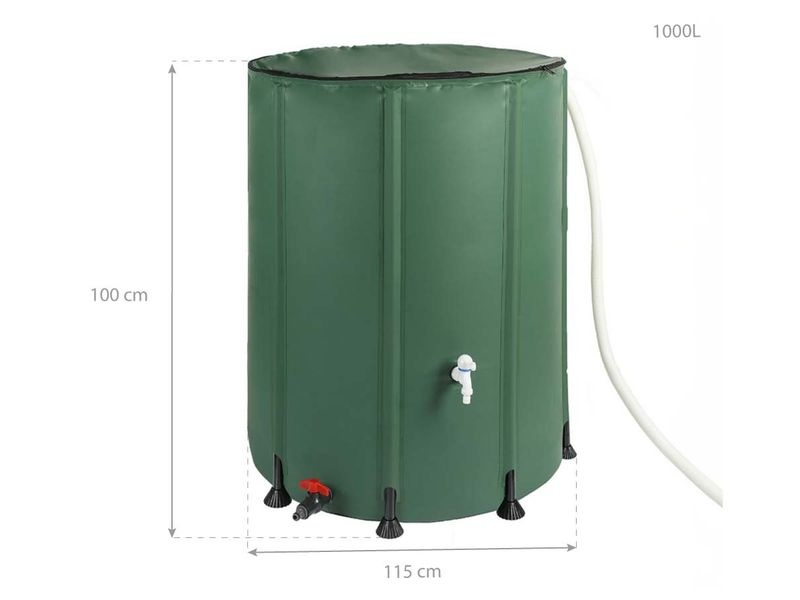 Die Tonne besteht aus strapazierfähigem 600D PVC und wird durch einen Rahmen aus 10 PVC-Stäben (Ø 20 mm) stabilisiert. Der Deckel ist mit einem Reißverschluss und einem integrierten Schutznetz gegen Verunreinigungen ausgestattet, sodass das Wasser sauber bleibt. Praktische Ablassventile ermöglichen die Nutzung sowohl mit einem Schlauch als auch mit einer Gießkanne. Ein integrierter Überlauf verhindert das Überfüllen. Das einfache Montagesystem ermöglicht den Aufbau in kürzester Zeit und ohne Spezialwerkzeug.