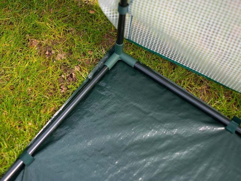 Die stabile Stahlkonstruktion ist mit einer robusten UV-stabilen Folie überzogen, die im Sommer vor intensiver Sonneneinstrahlung schützt und im Winter eine isolierende Wirkung gegen Kälte bietet. Außerdem ist ein Belüftungsfenster integriert, das die Regulierung von Temperatur und Luftfeuchtigkeit im Inneren erleichtert. Der Eingang ist mit einer praktischen Reißverschlusstür versehen, die sich bequem öffnen und fixieren lässt.