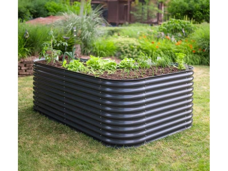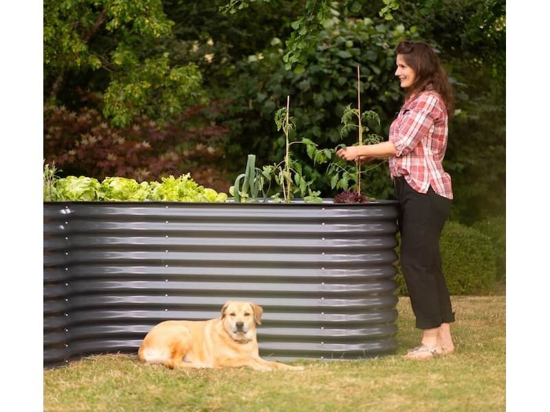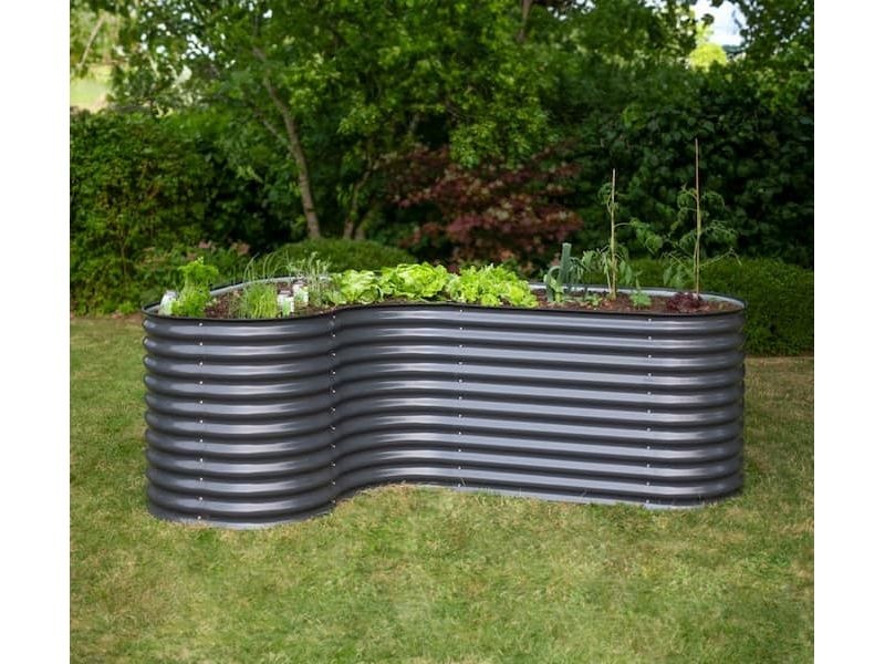 Es ist vielseitig und funktional. Der Korpus besteht aus verzinktem Stahlblech mit Wellprofil, wodurch das Beet korrosionsbeständig und pflegeleicht ist.
