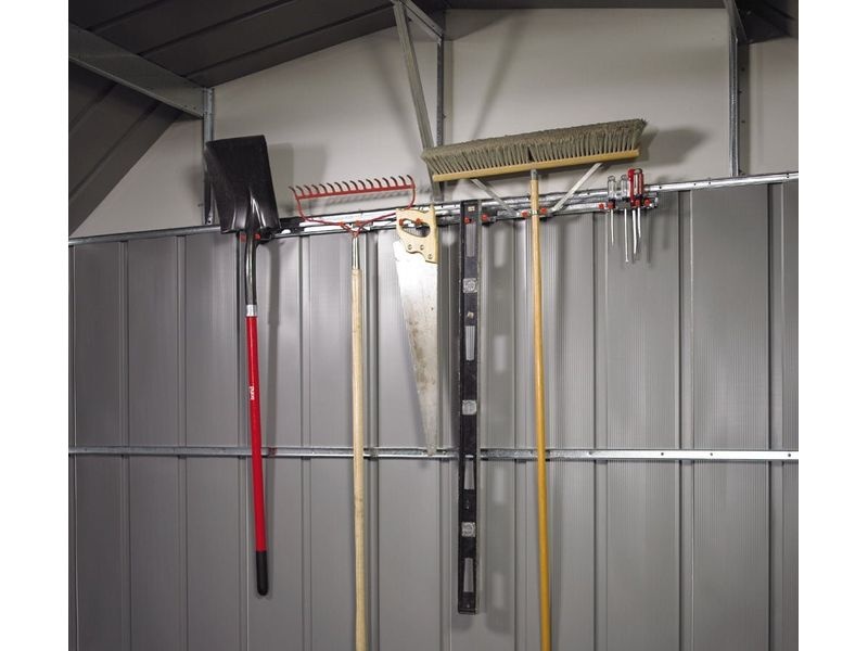 Dank der mitgelieferten Haken verstauen und organisieren Sie problemlos Besen, Laubrechen, Schaufeln, Kehrbesen und vieles mehr.
