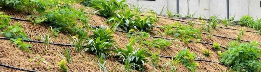 In Kombination mit Erosionsschutzmatten und -netzen werden auf Hängen am häufigsten Gräser oder bodendeckende Pflanzen eingesetzt.