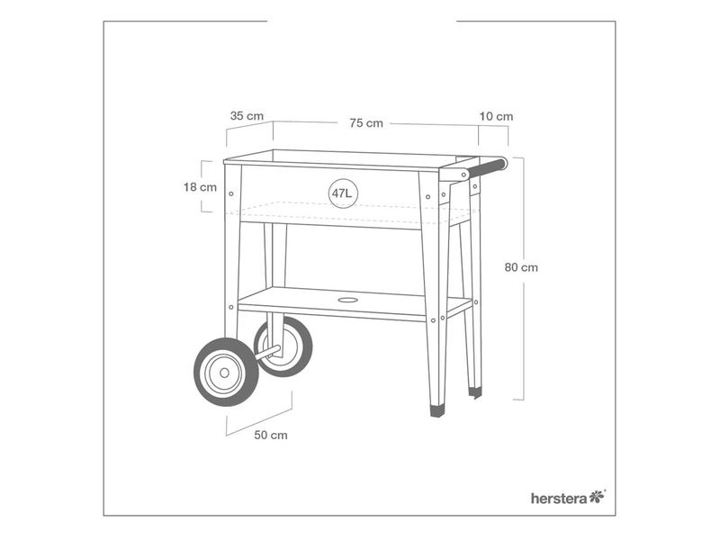 Dieses moderne Hochbeet hat eine ideale Größe für Terrassen, Balkone und Gärten. Durch die Rollen und den Griff lässt es sich leicht verschieben. Es eignet sich für alle Arten von Pflanzen, auch für Kräuter. Dank seiner ergonomischen Höhe ermöglicht es eine rückenschonende Gartenarbeit.
