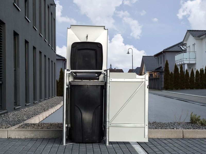 Im Deckel ist ein Haken mit Seil integriert, wodurch sich beim Öffnen der Box automatisch auch der Deckel der Mülltonne öffnet. Das Deckel kann nach vorne oder hinten geöffnet werden, Türen und Deckel lassen sich auch separat öffnen. Dadurch kann die Box auch zur Lagerung von Gartengeräten genutzt werden.