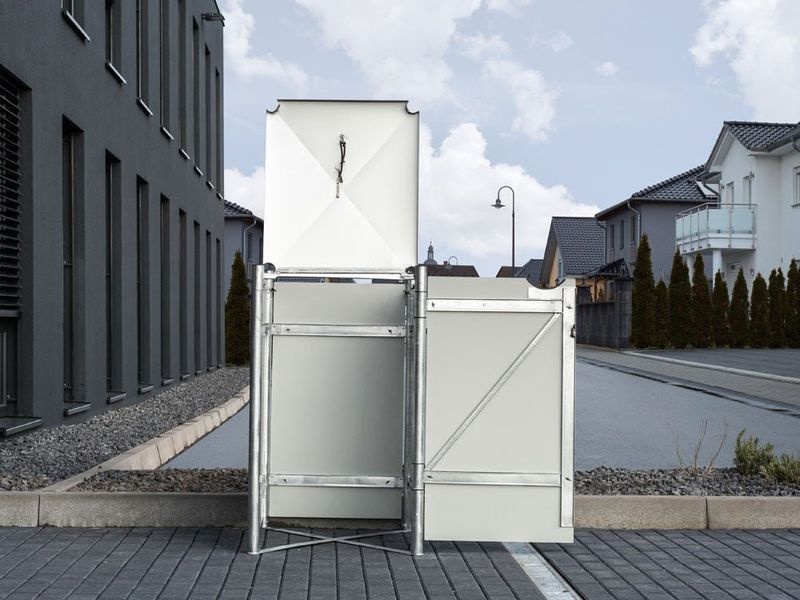 Die Box besteht aus einem feuerverzinkten Stahlrahmen und Aluminium-Verbundplatten. Die Materialien sind witterungsbes­tändig, regen- und feuchtigkeitsre­sistent und erfordern keine aufwendige Pflege.