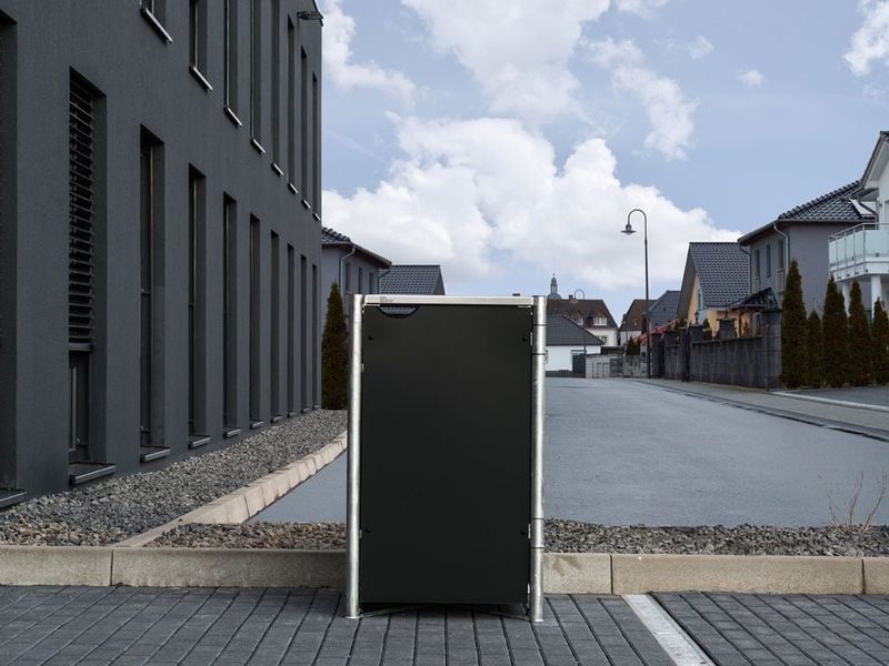 Die Metall-Mülltonnenbox Hide ist eine praktische Lösung zur Aufbewahrung einer Mülltonne mit 240 l Volumen. Durch das elegante schwarze Design passt sie zu jedem Haus oder Garten und schützt die Tonne zugleich vor Witterung und Feuchtigkeit.