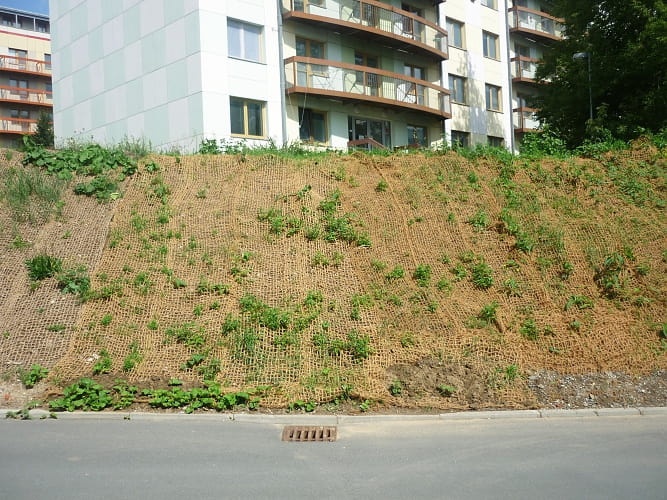 Anderenfalls droht die Gefahr, dass das Geotextil mit dem Kokosnetz (etwa bei Schnee- oder Gehbelastung) von einem so steilen Hang abrutschen. Es ist klar, dass in der Krone kein Gras durch das Geotextil wächst, doch hier kommen Bodendecker oder niedrige Sträucher mit Erfolg zum Einsatz.