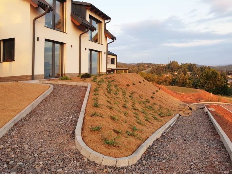 Anderenfalls droht die Gefahr, dass das Geotextil mit dem Kokosnetz (etwa bei Schnee- oder Gehbelastung) von einem so steilen Hang abrutschen. Es ist klar, dass in der Krone kein Gras durch das Geotextil wächst, doch hier kommen Bodendecker oder niedrige Sträucher mit Erfolg zum Einsatz.