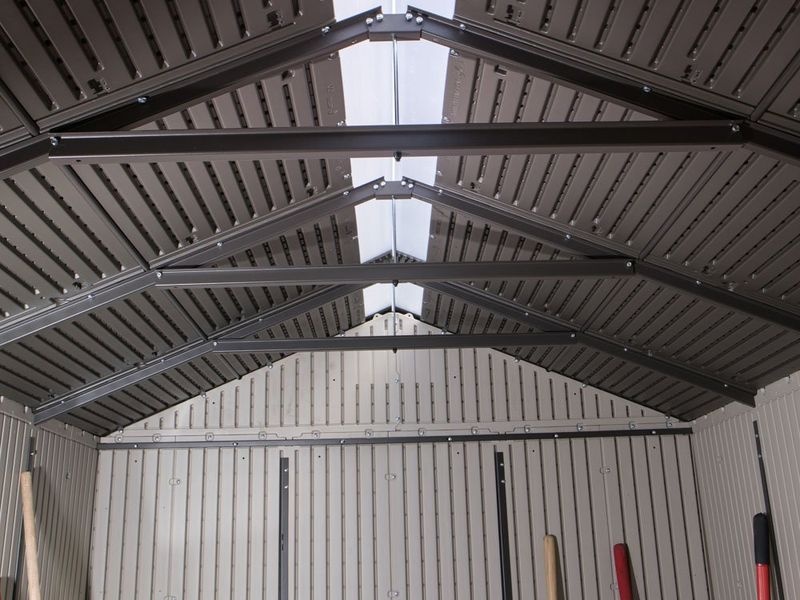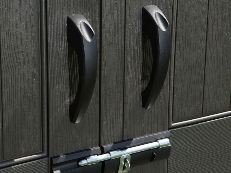 Die Dachkonstruktion aus hochfestem Stahl hält einer Belastung von bis zu 195 kg/m² stand. Die Dachneigung dieses Gartenhaus-Modells beträgt 30 Grad, was die Menge und den Druck von Schnee auf die Dachkonstruktion deutlich reduziert. Das Gartenhaus ist außerdem mit zweiflügeligen Türen an Scharnieren ausgestattet, die mehr Komfort beim Verstauen von Werkzeugen und anderem Zubehör im Kunststoffhaus bieten.