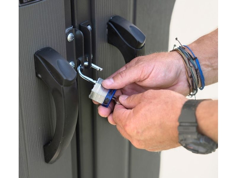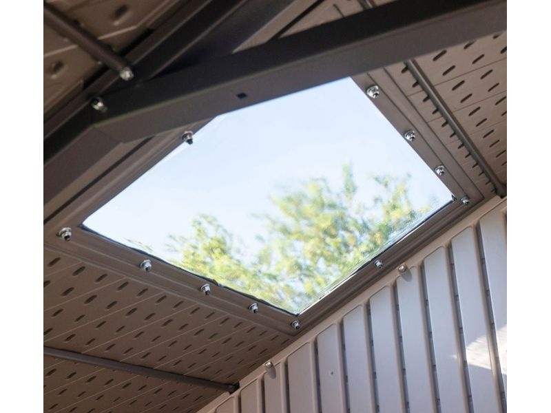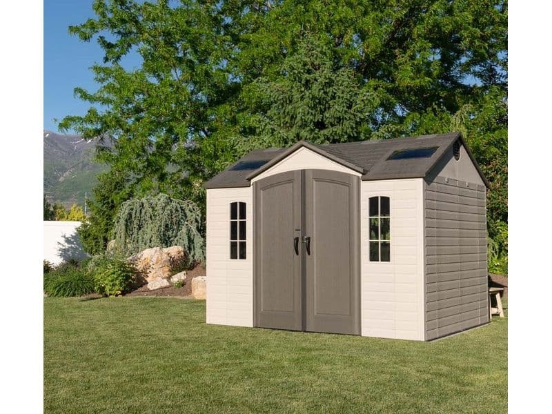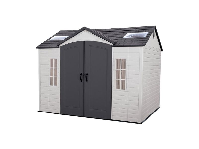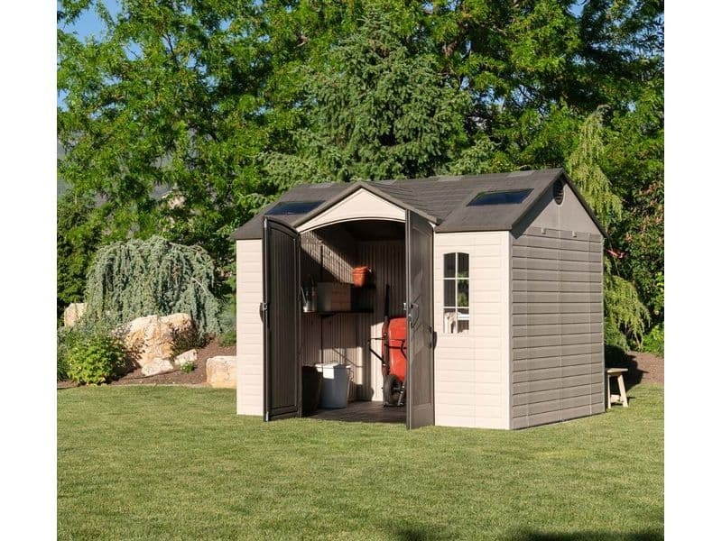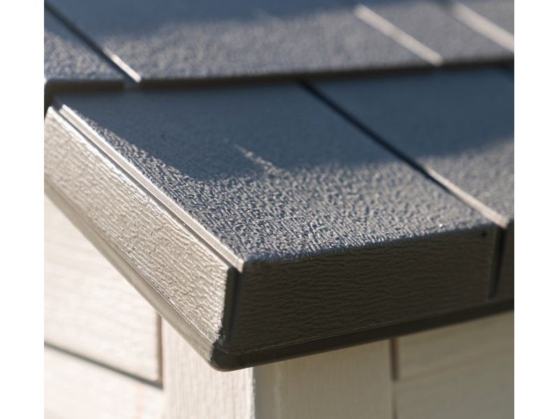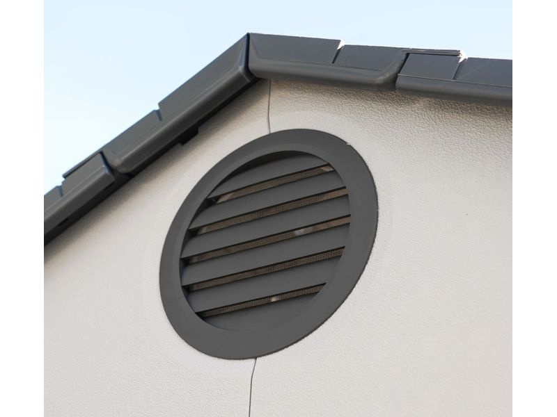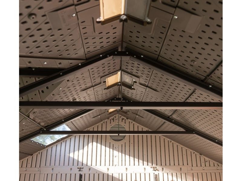 Die Dachneigung dieses Modells beträgt 30 Grad, was die Menge und den Druck von Schnee auf die Dachkonstruktion deutlich reduziert. Das Gartenhaus ist außerdem mit zweiflügeligen Türen an Scharnieren ausgestattet, die mehr Komfort beim Verstauen von Werkzeugen und anderem Zubehör im Kunststoffhaus bieten.