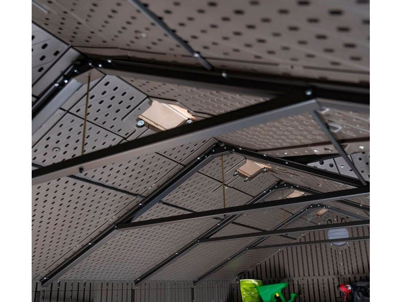 Das Gartenhaus erhält seine enorme Stabilität durch die Konstruktion aus doppelwandigem, stahlverstärktem HDPE-Kunststoff (Hartpolyethylen). Die Dachkonstruktion aus hochfestem Stahl hält einer Belastung von bis zu 115 kg/m² stand, und die ideale Dachneigung von 23 % ermöglicht zudem ein schnelles Ablaufen von Wasser und Schnee. Zum Lieferumfang des Gartenhauses gehört ein rutschfester Boden.