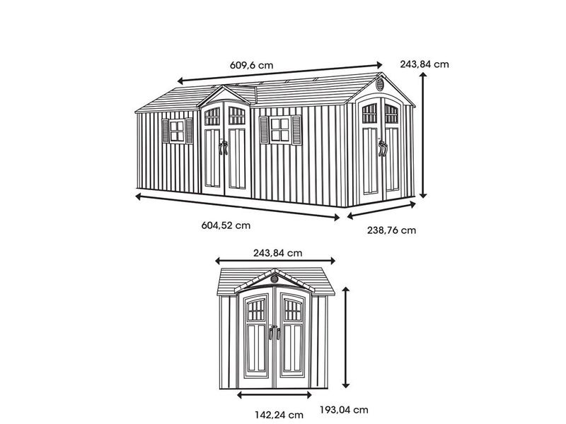 Das Gartenhaus ist außerdem mit zwei doppelflügeligen, verglasten Türen ausgestattet, die mehr Komfort beim Verstauen von Werkzeugen und anderem Zubehör bieten. Dank der glatten, hellgrauen Oberfläche der Wände fügt sich das Haus dezent und unauffällig in nahezu jeden Garten ein.