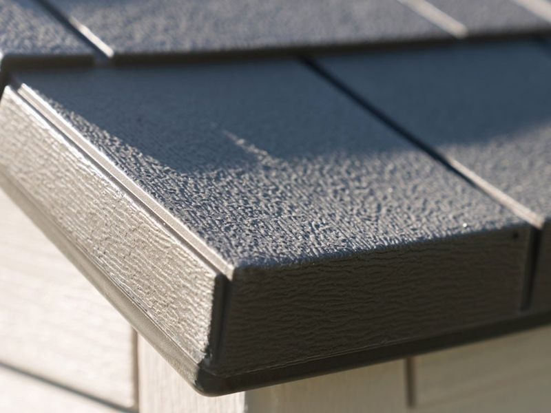 Die Stärke der doppelten Kunststoffwände beträgt 26 mm. Das Material des Hauses – hochbeständiges Polyethylen mit UV-Filter – vergilbt nicht und wird unter Sonneneinstrahlung nicht spröde. Dadurch entfällt die Notwendigkeit regelmäßiger Anstriche, wie sie bei Holz-Gartenhäusern gelegentlich erforderlich sind. Das Gartenhaus Kunststoff ist daher nahezu wartungsfrei.