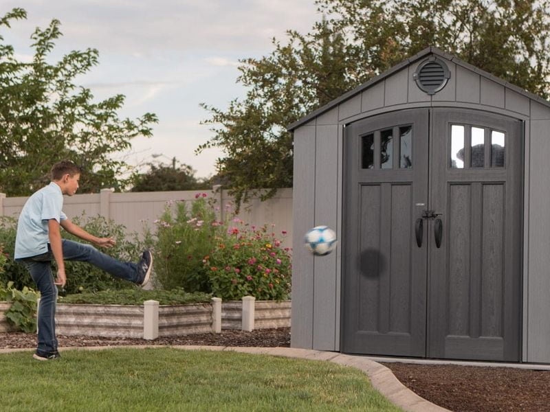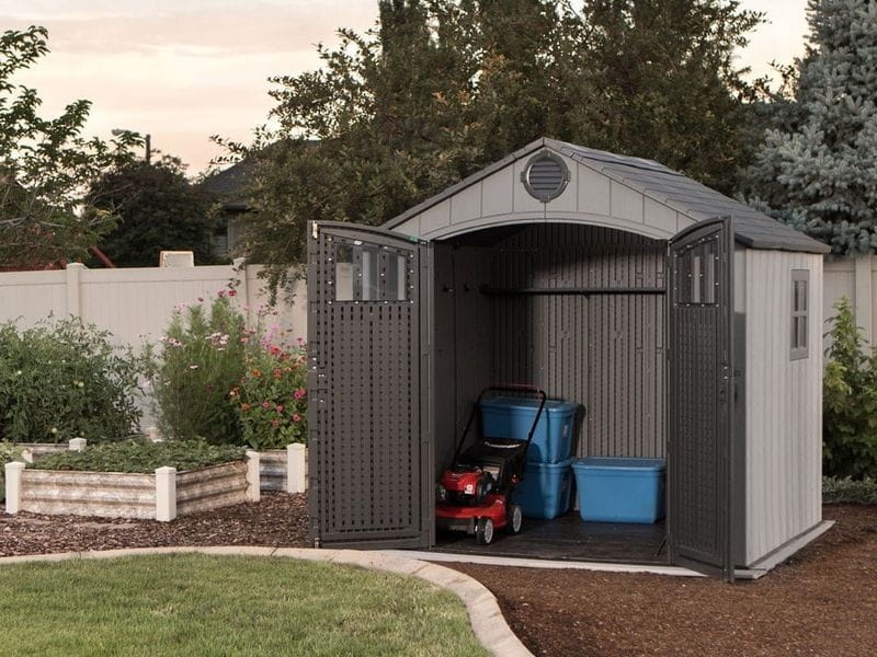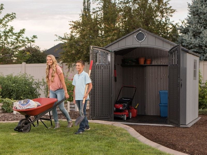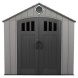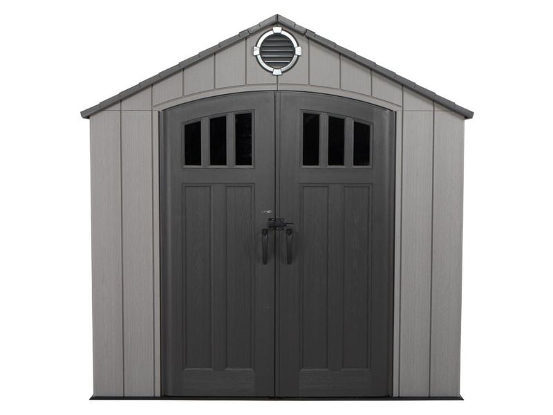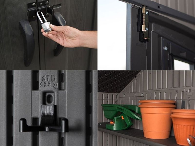 Zum Haus gehören außerdem große Doppelflügeltüren, die einen einfachen Zugang und das problemlose Verstauen auch breiterer Gartengeräte ermöglichen. Ebenfalls enthalten ist ein Regal (228×25 cm) für z. B. einen Werkzeugkoffer sowie sechs Wandhaken, an denen Sie Gartenscheren oder andere Werkzeuge immer griffbereit haben.