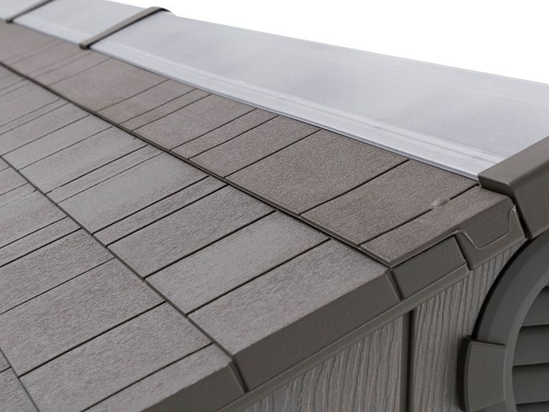 Die Konstruktion aus doppelwandigem, mit Metall verstärktem HDPE-Kunststoff (Hartpolyethylen) sorgt für die enorme Stabilität des Gartenhauses. Die Dachkonstruktion aus hochfestem Stahl hält hoher Schneelast stand, und die ideale Dachneigung ermöglicht zudem einen schnellen Abfluss von Wasser und Schnee.