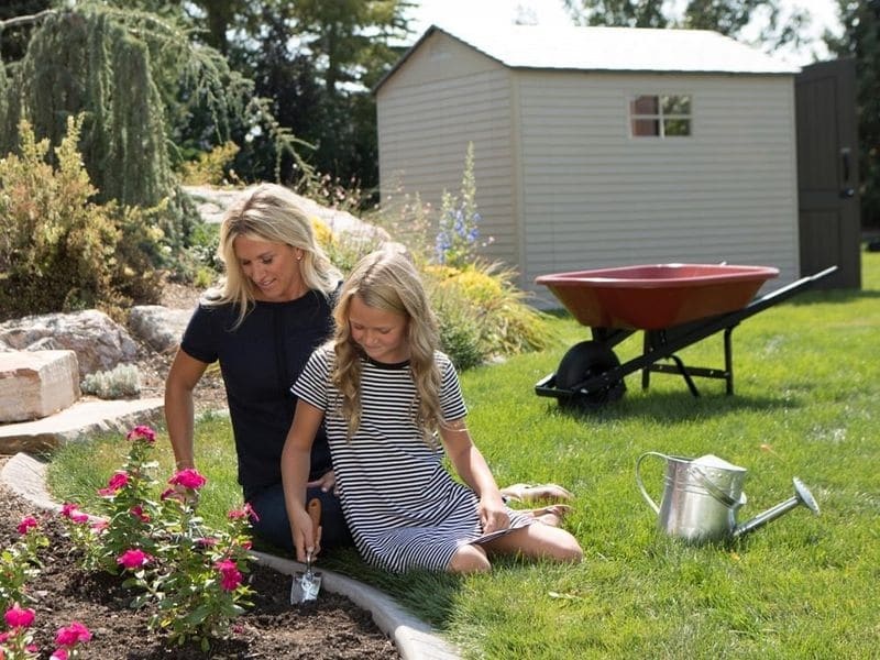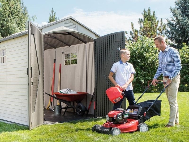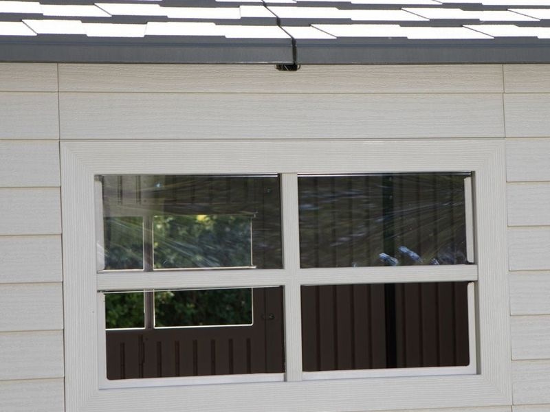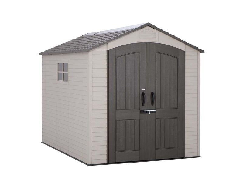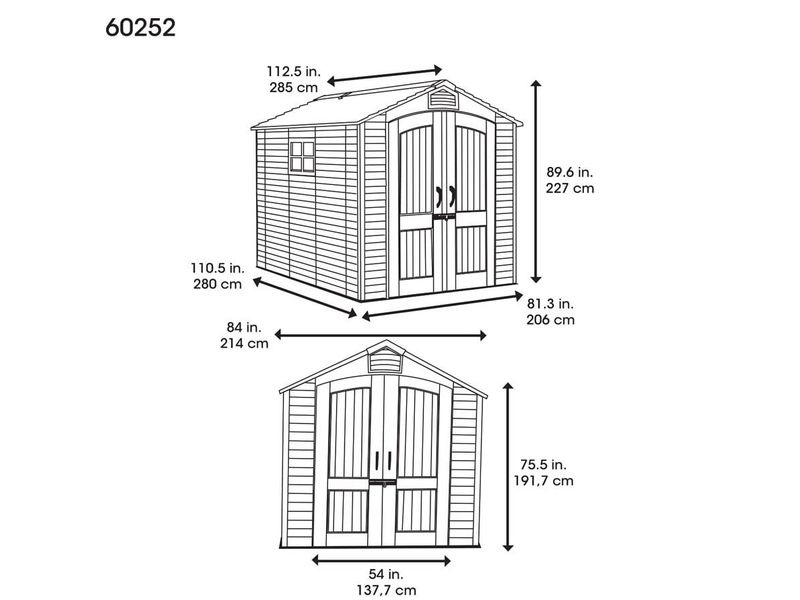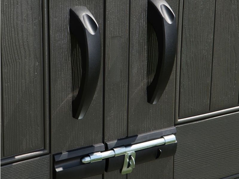 Zum Haus gehören außerdem große Doppelflügeltüren, die einen einfachen Zugang und das problemlose Verstauen auch breiterer Gartengeräte ermöglichen. Ebenfalls enthalten ist ein Regal (76 × 25 cm) für z. B. einen Werkzeugkoffer sowie zwei Eckregale für zusätzlichen Komfort.