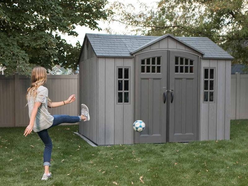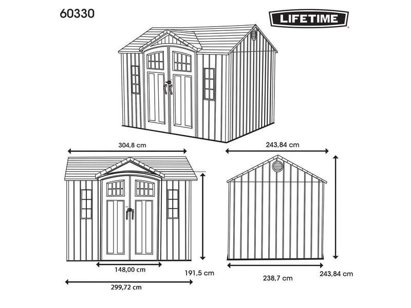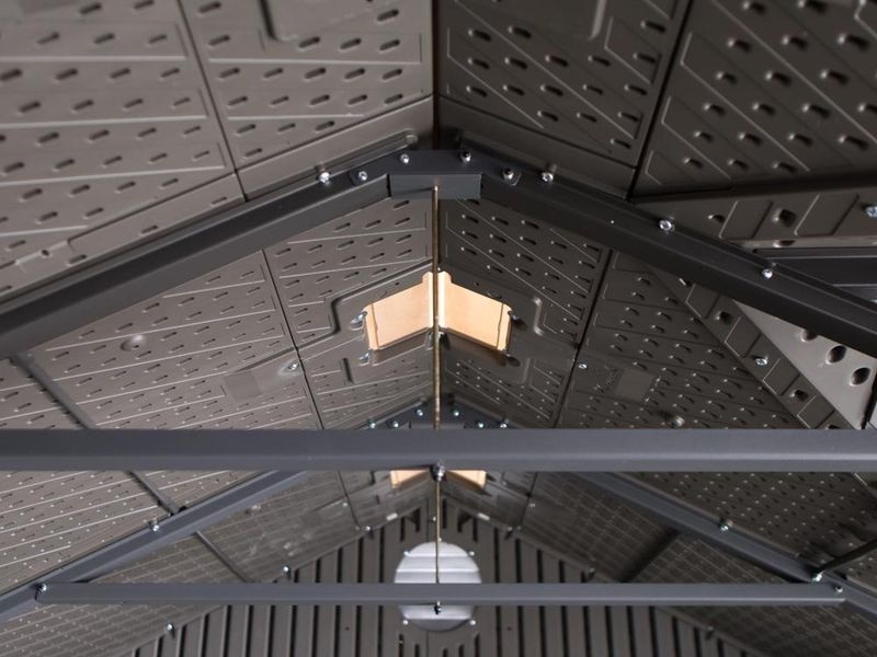 Die Konstruktion aus doppelwandigem, mit Metall verstärktem HDPE-Kunststoff (Hartpolyethylen) sorgt für die enorme Stabilität des Gartenhauses. Die Dachkonstruktion aus hochfestem Stahl hält einer Belastung von bis zu 112 kg/m² stand, und die ideale Dachneigung ermöglicht zudem einen schnellen Abfluss von Wasser und Schnee.