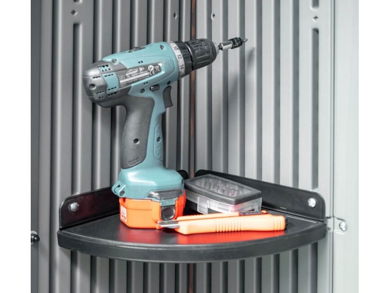 Zum Gartenhaus gehört ein Regal (76 × 25 cm), auf dem Sie z. B. Ihren Werkzeugkoffer abstellen können, sowie zwei Eckregale, die zusätzlichen Komfort bieten.