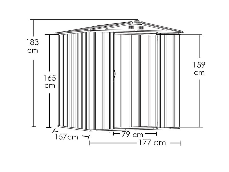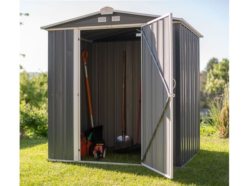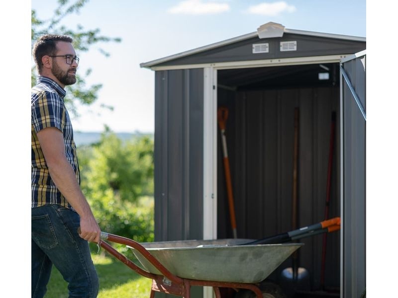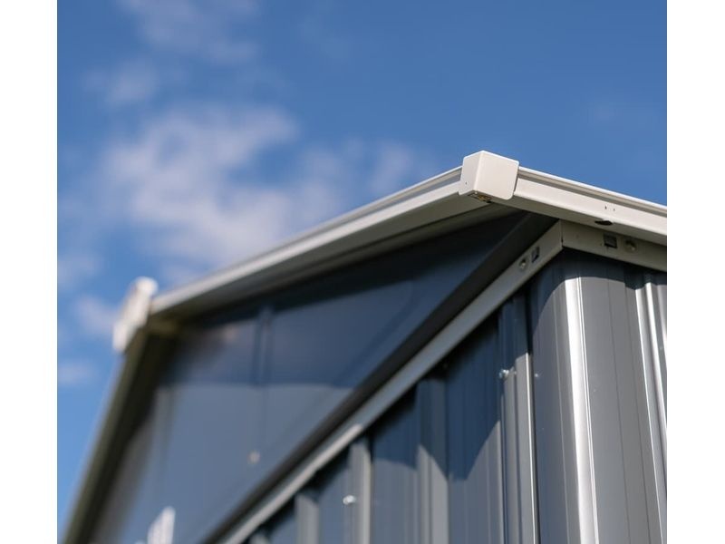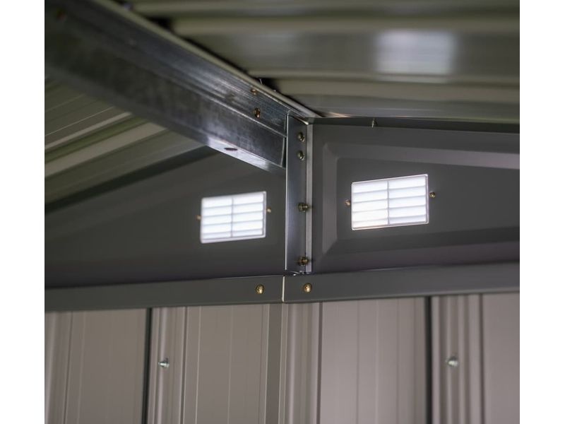 Das klassische Satteldach ist mit Lüftungsschlitzen ausgestattet, die die Temperatur regulieren und die Luftzirkulation verbessern. Dadurch wird die Hitze und Feuchtigkeit in Ihrem Metallhaus reduziert.
