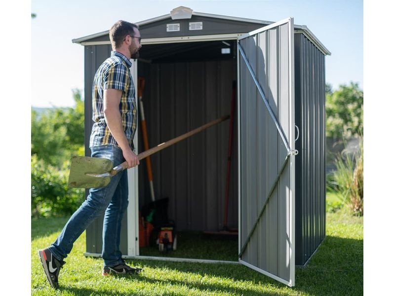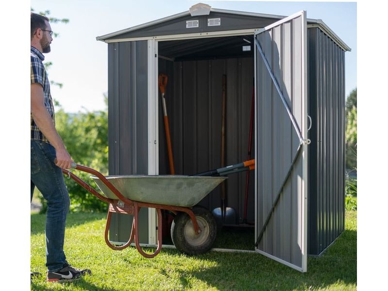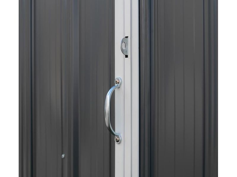Das Metall-Gartenhaus ist aus elektrolytisch verzinktem Stahlblech gefertigt. Die stilvolle Hütte ist zusätzlich mit Flügeltüren ausgestattet, die sich mit einem Stahlgriff leicht bedienen lassen. So können Sie kleine und große Gegenstände problemlos aus der Hütte tragen, ohne dass die Flügeltüren im Weg sind. Eine Vorrichtung für ein Vorhängeschloss ermöglicht die Sicherung der eingelagerten Geräte (Vorhängeschloss nicht im Lieferumfang enthalten).