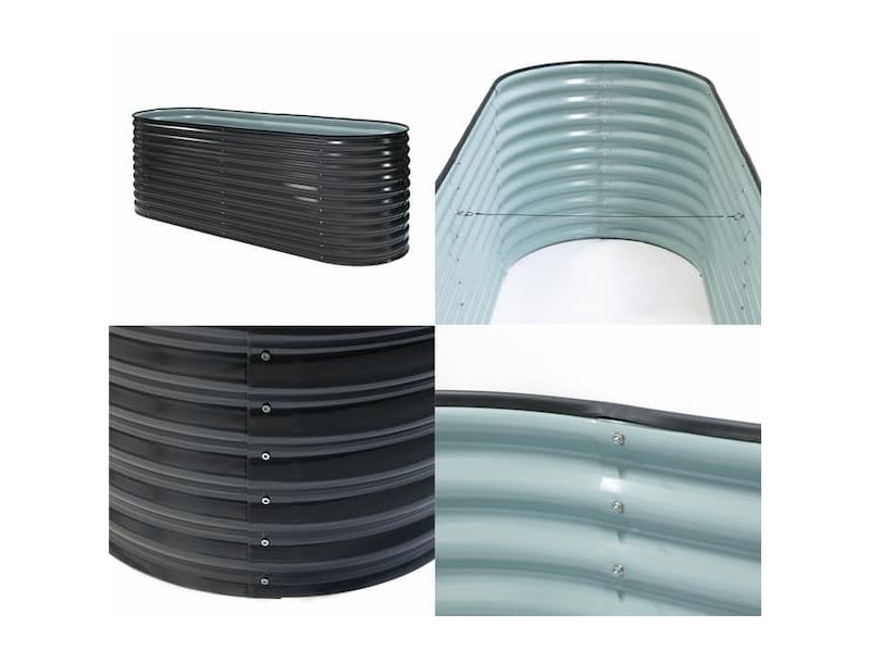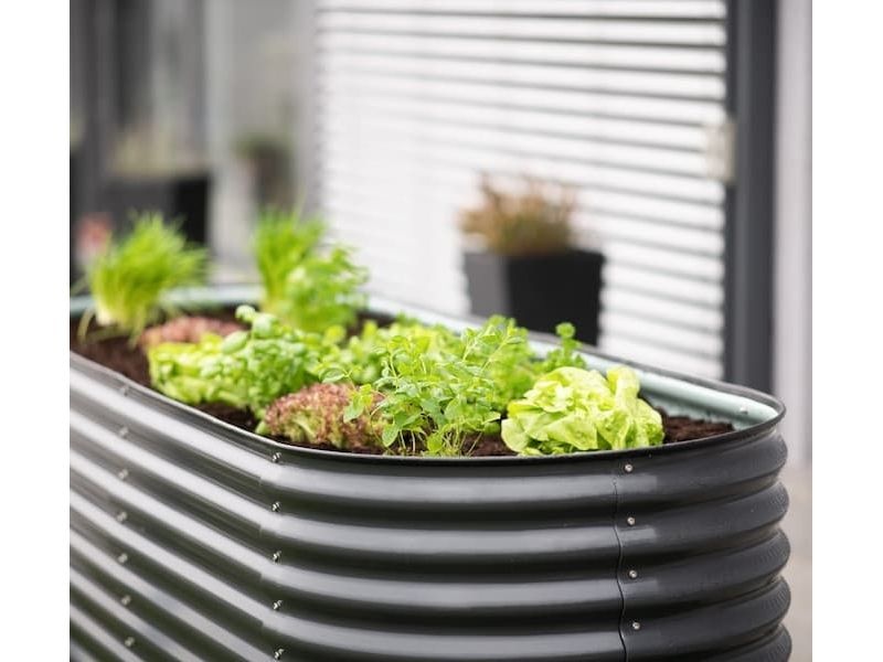 Es ist vielseitig und funktional. Der Korpus besteht aus verzinktem Stahlblech mit Wellprofil, wodurch das Beet korrosionsbeständig, langlebig und leicht zu pflegen ist.