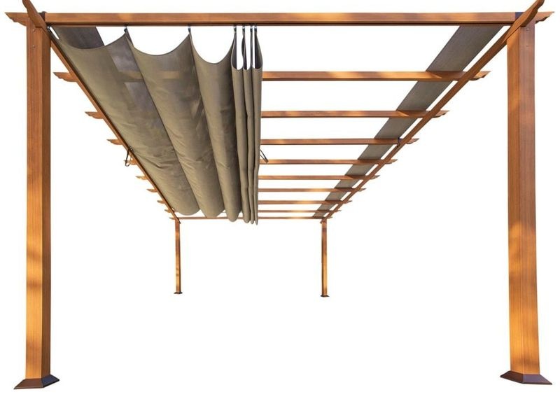 Die Konstruktion besteht aus pulverbeschichtetem Aluminium, das bis zu 20 % stärker ist als herkömmliche Materialien. Eine spezielle Oberflächenbehandlung sorgt für eine authentische Holzoptik. Gleichzeitig ist die Pergola rost- und wetterbeständig und nahezu wartungsfrei.