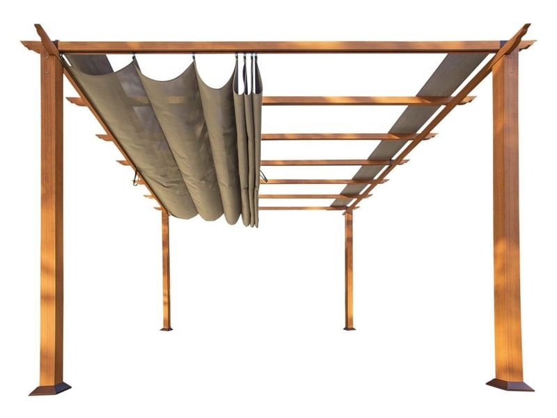 Die Pergola ist nicht mit einem festen Hardtop ausgestattet, sondern mit einer luftigen Lamellenkonstruktion. Für flexible Beschattung sorgt ein Polyester-Sonnensegel mit einer Stärke von 0,8 mm, das bis zu 70 % UV-Schutz bietet. Das Tuch ist wasserabweisend und lässt sich leicht mit einem weichen Tuch und Seifenwasser reinigen.