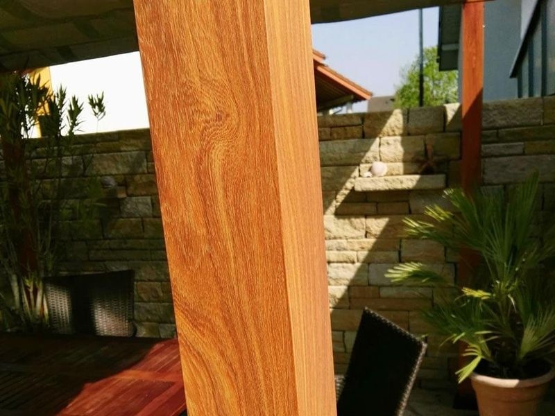 Die Konstruktion der Pergola besteht aus widerstandsfähigem Aluminium mit Pulverbeschichtung, das bis zu 20 % stärker ist als herkömmliche Materialien. Die Oberflächenbehandlung sorgt für eine authentische Holzoptik, während die Pergola rost- und wetterbeständig bleibt. Dadurch ist sie nahezu wartungsfrei.