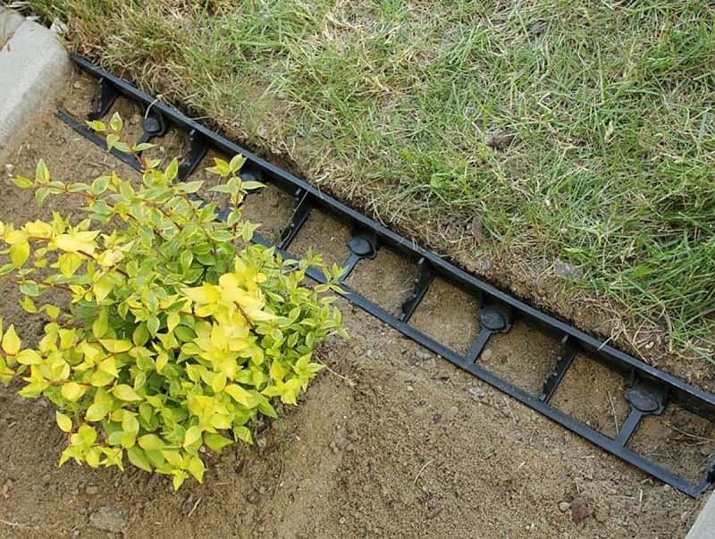 Die unsichtbare Rasenkante aus Kunststoff kann gebogen oder um die Baumwurzeln herum geformt werden. Sie wird unter der Geländeoberfläche eingebaut, wobei der obere Rand etwa 5 mm aus dem Boden herausschauen soll. Wollen Sie Rasen und Pflaster voneinander trennen, soll die Höhe der Rasenkante mindestens der Pflasterhöhe entsprechen.