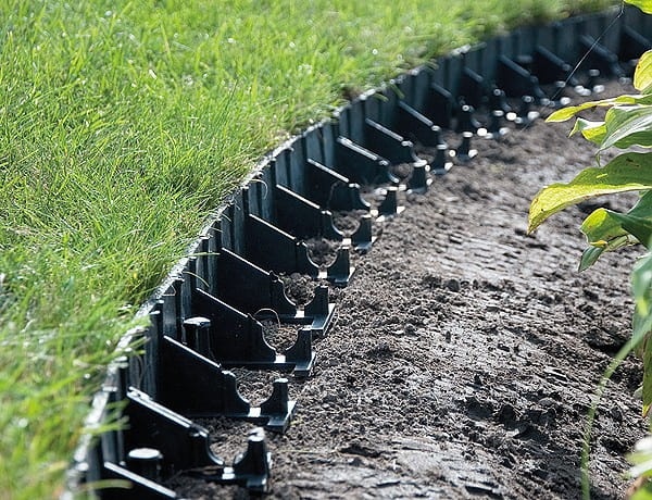 Die Rasenkanten aus Kunststoff werden mit 25 cm langen Erdnägeln befestigt (standardmäßig nicht im Lieferumfang enthalten). Je nach der Form werden pro Meter Rasenkante jeweils 2–3 Erdnägel, bei steilen Bögen jeweils 5–6 Erdnägel benötigt. Zum Einbau sind übliche Gartenwerkzeuge ausreichend (Spaten, Hammer, Säge, Zange …). Die Kanten können ausgebaut und später wieder eingebaut werden.