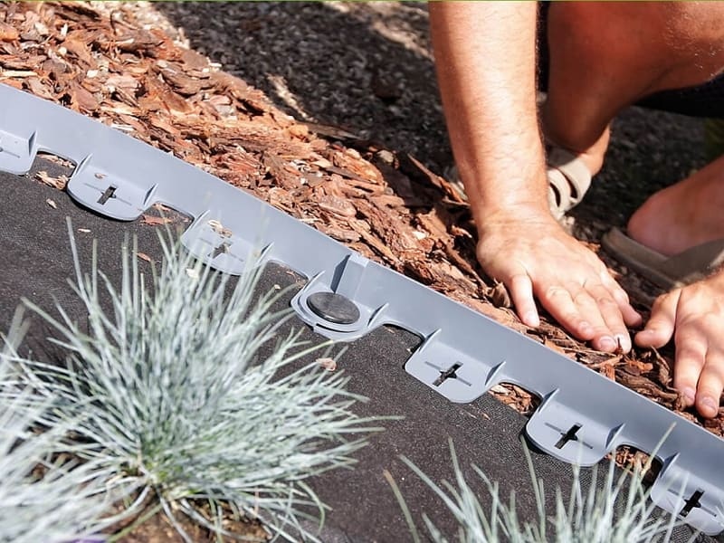 Die unsichtbare Rasenkante wird mit den beigepackten Erdnägeln einfach im Boden verankert. Das nächste Kantenelement wird durch Zusammenklicken der integrierten Klicksystemschlösser angeschlossen und es geht los mit der Gestaltung beliebig langen Rasenkanten.